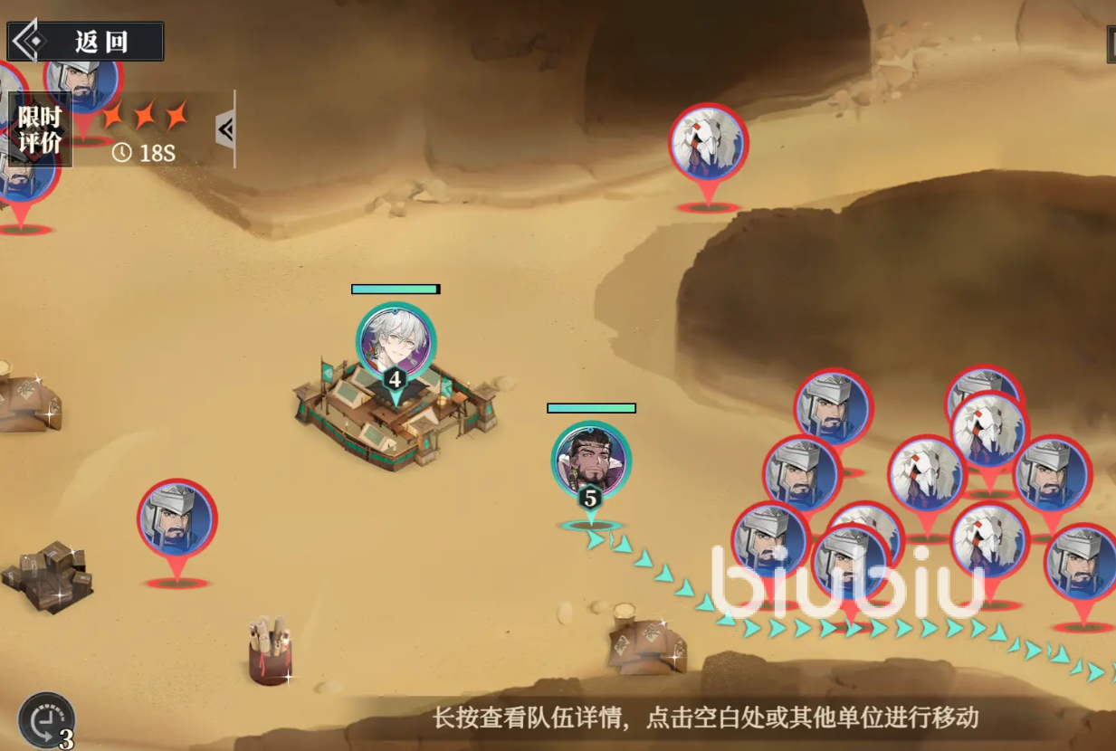 大家通关第六章“疑重续”就能参与其中,正式开始任务后,大家将进入战场关卡,在战场环节,如果各位想达成星级评价,需要在限定的时间内保护好己方据点,并将自己的武将组成多个队伍,指挥部队击败敌方将领,并将敌方帅府占领后就获胜,如果我方帅府被攻占,则全部队伍都会失败,也就是会被判定成游戏失败。