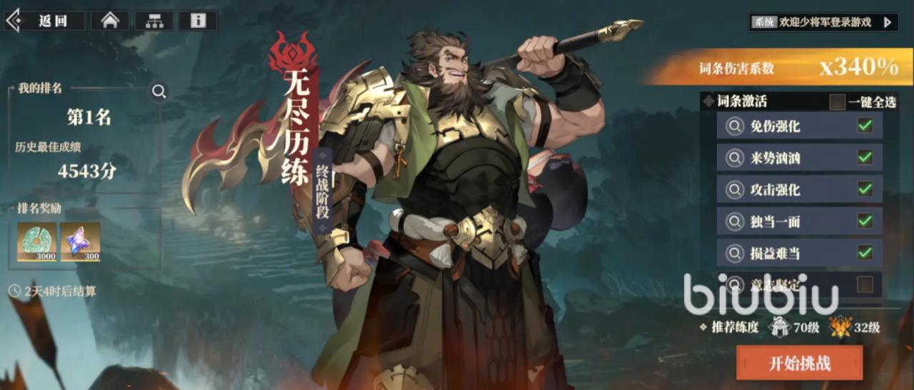然后是无尽试炼,在其中“张飞”将化身成终极boss,而挑战总共会分为三个阶段,8.15到8月19是初临阶段,8.19到8.24是再遇阶段,8.24到8.29是终战阶段,这三个阶段逐步开放,大家在挑战前可选择不同数量的词条来获得伤害系数加成,挑战达到制定分数,大家可在任务出领取到“金翎箭”,用于兑换黄忠、七杀符等。