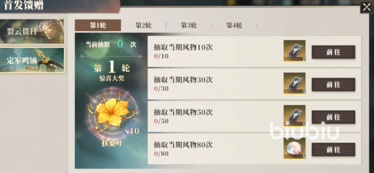 最后在活动期间,大家可参与“裂云贯日黄忠”、“定军鸣镝风物”主题卡池招募,累积招募到指定次数能拿到扶桑叶、玄龙珠等奖励,并且还可以结算出多段丰厚礼品,包含神将自选、橙色风物自选等。