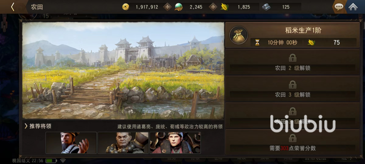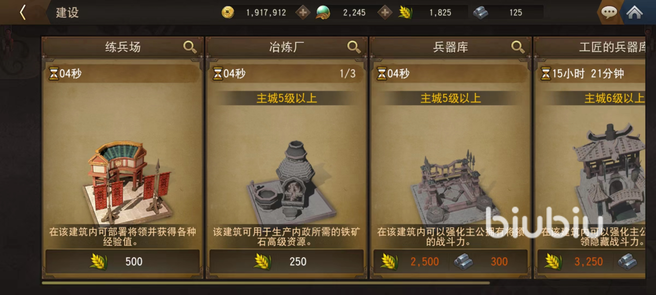 然后是准备各种各样资源建设城镇,主要需要的是稻米和铁矿,这两项都可以在主城内自己建造资源建筑获得。所以首先要做的就是先将这些能产生资源的建造好,比如农田可以生产稻米,冶炼厂可以生产铁矿石等,优先提升这些建筑才能获得更多资源去升级。