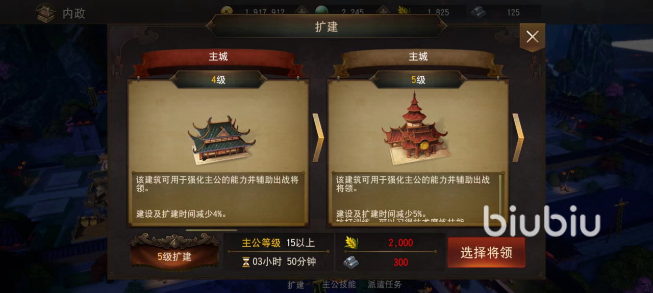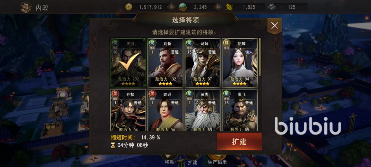 选中主城之后再选择扩建,就可以提高等级,除了消耗对应资源外,还需要选择一名合适将领参与到建造中。这就涉及到武将政治属性,政治力越高则建造时能够缩短更多的时间,所以大家可以培养一批政治成长比较高的武将,专门用于内政系统建筑建设。