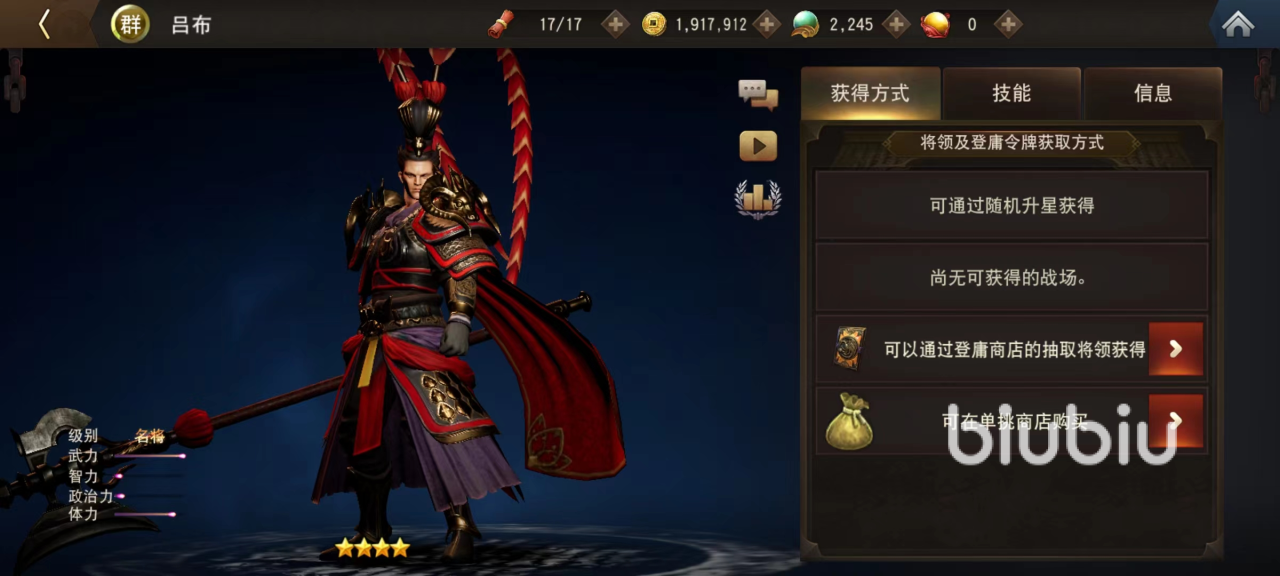 吕布是目前输出最高的武将,主动技能武神咆哮,将敌方拽到身侧并且有额外的物理伤害加成,使得目标在接下来受到的伤害提高。主动技能画戟破天,使用方天画戟进行一次强力攻击,在接下来的短暂时间内免疫失常状态影响。吕布自身就能完成聚怪清理等一系列操作,所以完全可以直接冲锋对大量敌人造成收割。而且吕布的被动技能还可以提高暴击率,在暴击时恢复体力,单打独斗也完全不虚。