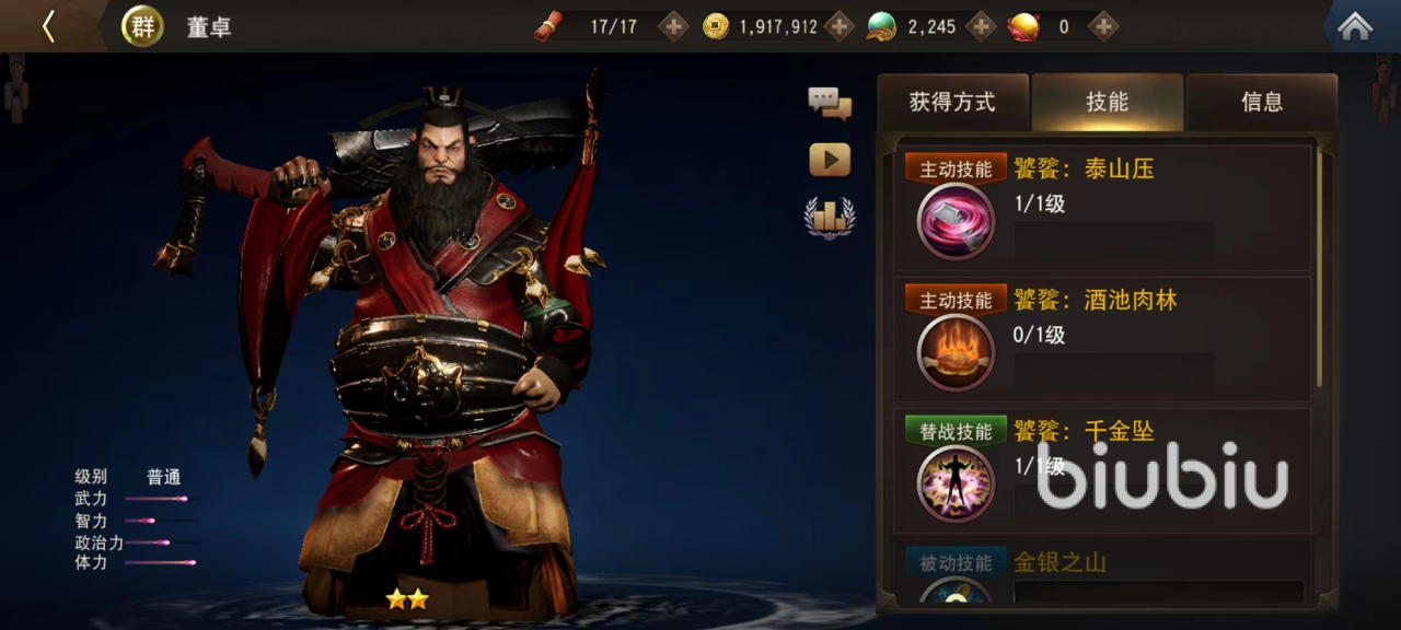 董卓和上面三人不同,不属于输出类型而且初始星级不高,但这并不影响他登顶排行榜。主动技能泰山压,旋转大刀打击敌人,并且能够凌空跳起撞击敌方。主动技能酒池肉林,快速吃下肉并且能大幅度恢复体力,接下来物理伤害提高。这是董卓赖以生存的技能,在战场中直接就能恢复体力,所以在扛怪方面非常擅长。而且在被动加成下,受到物理伤害降低,还可以额外获得金币。