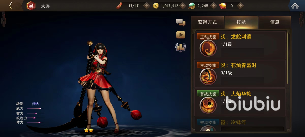 大乔和貂蝉同属于佳人类型,主动技能龙蛇刺镰,使用镰刀攻击前方敌人,将其击飞之后拉向自己。第2个技能花灿春盛时,使用镰刀打击前方敌人,使其腾空并且造成眩晕。大乔技能使用手感非常棒,而且有聚集效果,再加上附加控制,完全能够成为主力输出。在被动的影响下还可以提高攻击速度和技能伤害,非常全能的伤害型角色。