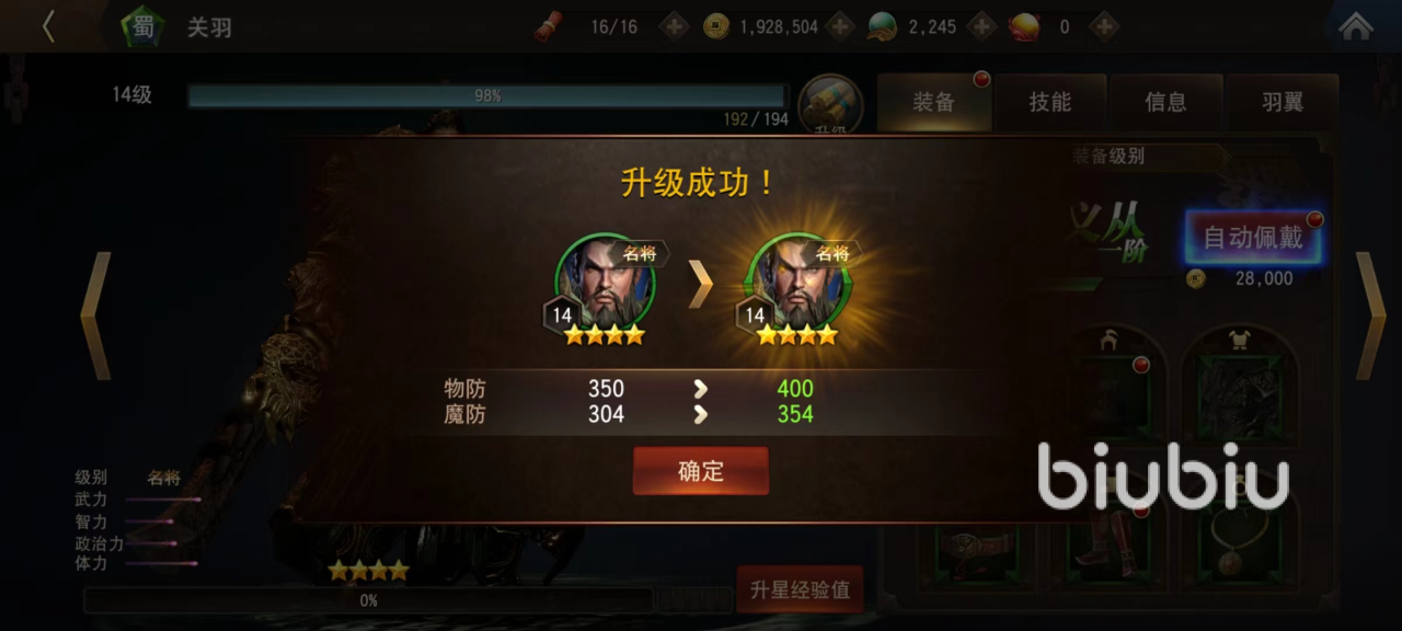 最后是装备,每一个武将都可以穿戴6件装备,无需大家去收集获得武将之后自动穿戴好装备,但是需要利用各种道具进行强化。强化需要对应的材料和铜币材料在副本中获得,如果道具充足,可以使用一键升级功能。