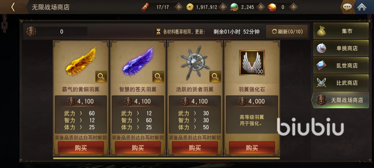 再往后是羽翼,可以提升武将主要能力值,但是只有当装备达到白耳级别以上的将领才能佩戴,所需要的道具可以去无限战场中通过铸币来购买。而后利用羽翼强化石进行强化,还存在有一定的几率,所以也是非常消耗资源的一项,不过对战力的提升却很关键,属于后期才进行的内容。