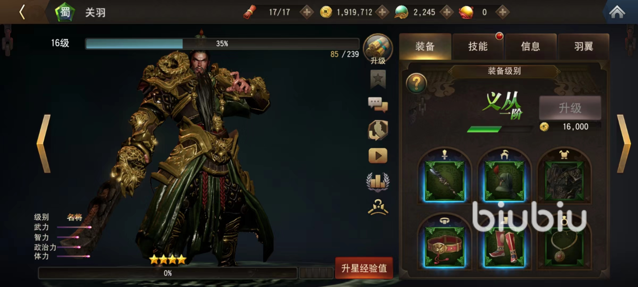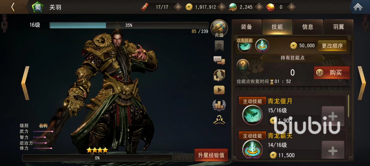 选中一个需要养成的武将后,首先要进行的是升级,因为等级才是最关键的一方面,升级需要用到兵书,兵书也按照品质进行划分,品质越高所提升经验也就越高。但目前武将等级存在上限,无法超过主公等级,所以此项培养虽然重要但是消耗的资源并不多,所有武将都能跟上。接下来是技能升级,每一个武将都有两个主动技能,一个替战技能和4个被动技能,因为前期装备的缘故所以被动技能只有两个,需要优先升级的是主力武将的主动技能。