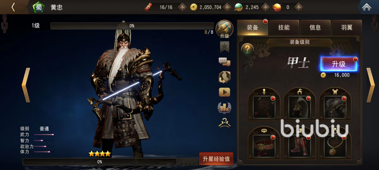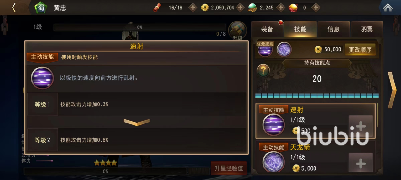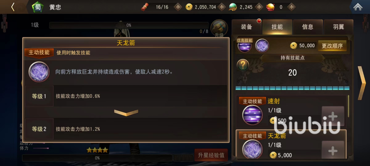 黄忠属于4星武将,在开局就能获得不错的属性成长,拥有单挑特技先发制人,在单挑时候可以抢先对敌方武将造成一次远距离攻击,这在单挑的时候也是比较有优势的。主动技能速射,以极快的速度向前方进行一次乱射,第2个技能天龙箭,瞄准前方释放出巨龙可以持续造成伤害,并且使得攻击目标减速。这两个都是非常好用的伤害技能,通过提升技能等级还将获得攻击力加成。