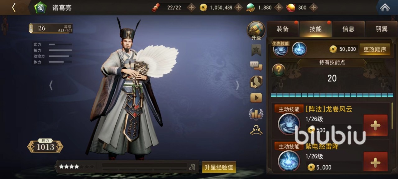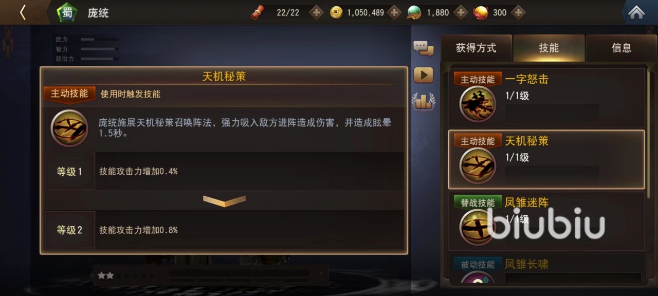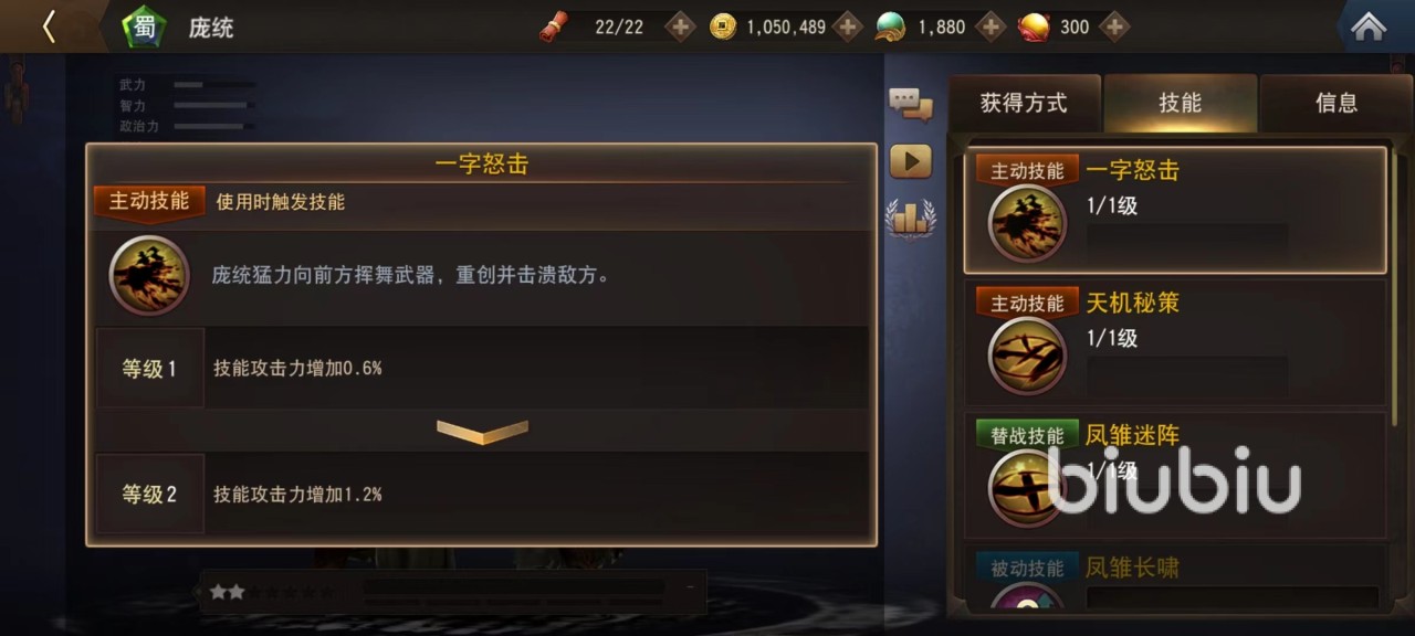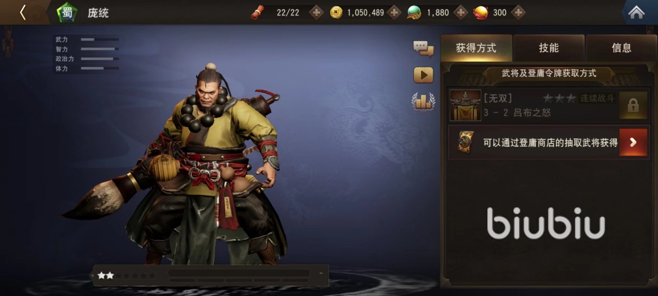 不得不说,游戏为庞统设计的这个造型确实值得吐槽,本来是谋士属性,但是生生打造成了一个大汉,使用的武器是一支非常硕大的毛笔。明明在历史中地位很高,拥有极高实力却只给了两星,幸好智力和政治力属性都很出色,弥补了外形上的不足,不然就真正失去了玩家喜爱。第1个主动技能挥舞着自己手中巨大毛笔重创前方敌军,第2个则是召唤出阵法,利用法术将附近敌方目标都吸进阵型里,除了造成伤害之外还有附加眩晕。