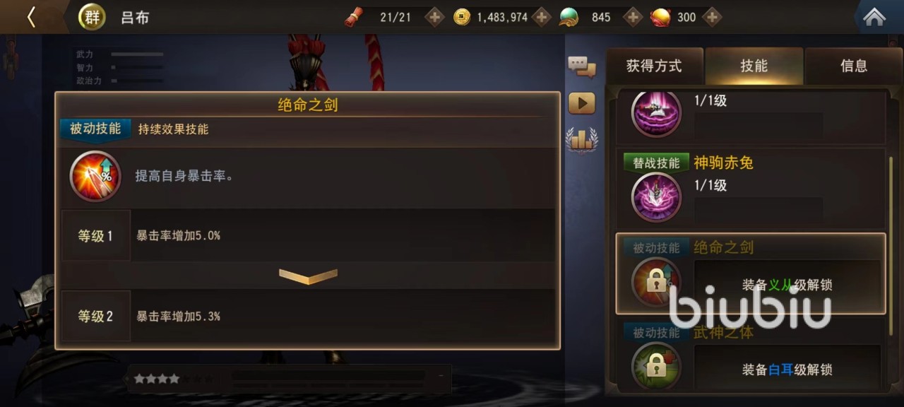 两个被动没有特殊效果,但都极其实用,绝命之剑直接提升自身暴击率,武神之体是在触发暴击时候有几率恢复生命值。被动强化了输出,吕布本身暴击就非常出色,在获得几率上提升更是刀刀见血,而恢复生命值特点是让陷入到重围之时不依赖其他恢复也能持续战斗。