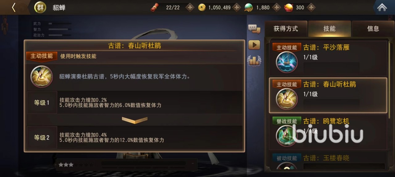 第2个主动技能是辅助效果,使用之后在5秒钟持续时间内大幅度恢复我方全体武将体力值。具体恢复数值和技能等级以及智力相关,好在拥有极高智力属性,所以在加血量上值得信赖。当替补出战时候只要登场就能降低全体受到的物理伤害,并且对敌方全体输出。从这两个技能效果来看,绝对是当前辅助能力最强一个,而且输出也不弱,最佳使用依然是替战登场。