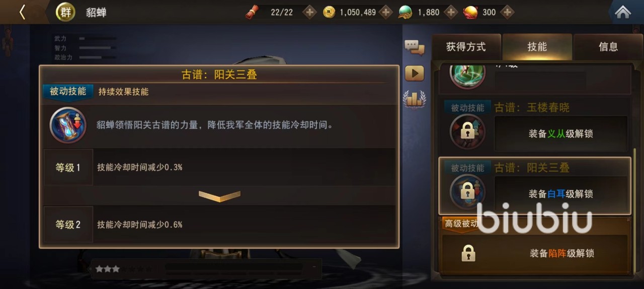 两个被动同样是团体辅助能力,第1个提高所有人的技能伤害,第2个降低技能冷却时间。相比于伤害提升,小编依然认为冷却时间降低更加关键,可以显著提升整体节奏,尤其是对于一些强力近战武将来说更是如此。所以貂蝉在搭配上也深受玩家喜爱,与吕布,董卓等这样强势人物一起出战,非常好用。