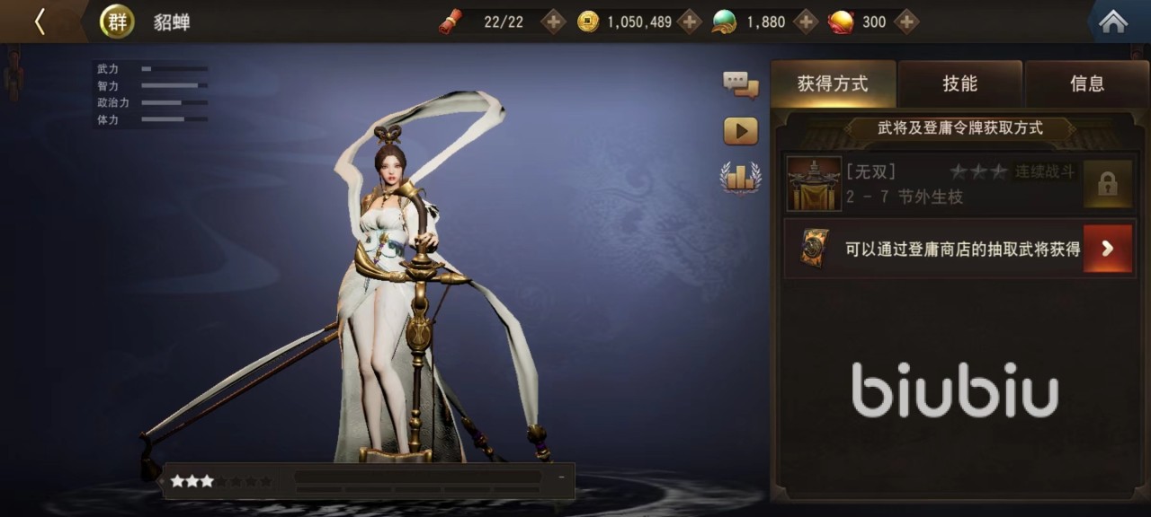 2023年03月13日 15:17 来源:绝世又卡卡特罗1貂蝉作为三国时期最知名的女性角色,自然不能仅仅好看,也加入了一系列强势技能,成为三国诛将录中非常好用的角色之一,今天一起来看下三国诛将录貂蝉怎么玩。熟悉一名武将之后才能做出最合适搭配,以及选择其首发或是替补,这一切都要先从技能效果上进行分析,毕竟这是武将进行战斗的基本手段。