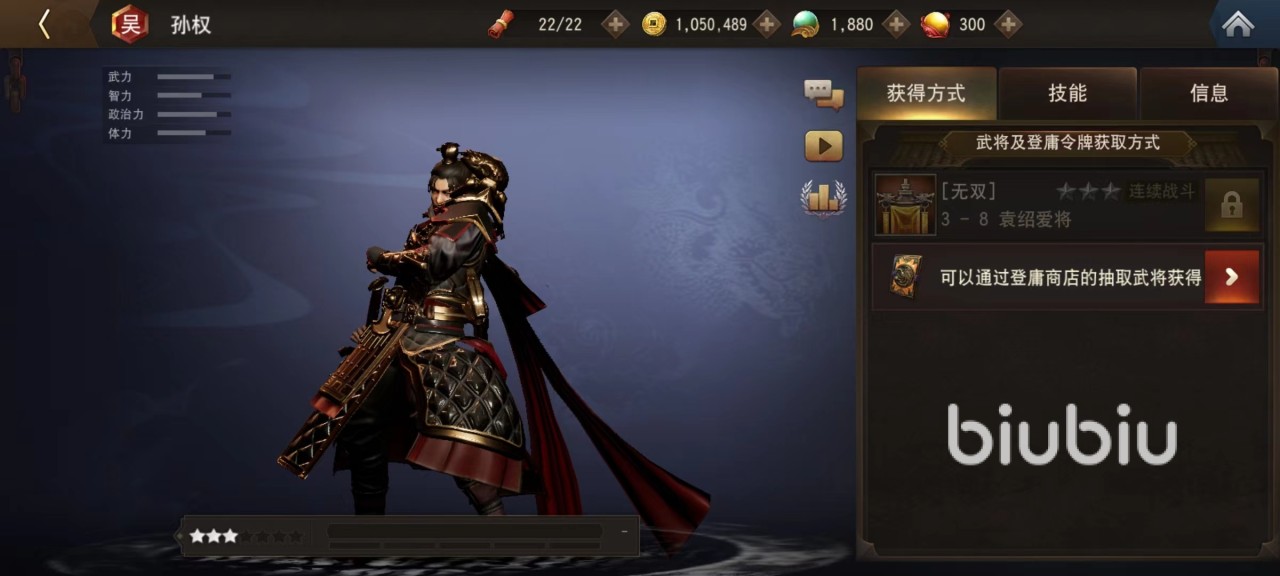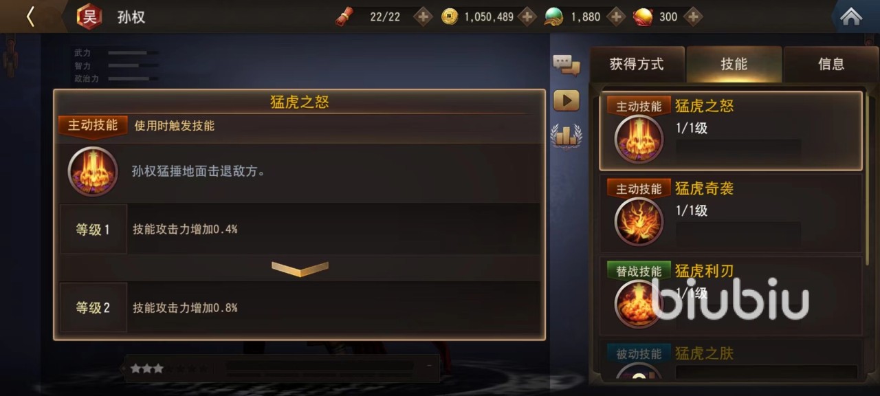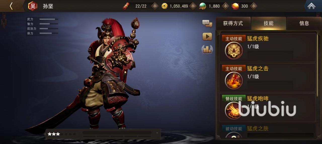 在搭配之前要先了解孙权主要技能特点和定位,作为一名三星角色,在武力和体力方面其实并不出色,好在技能效果伤害很足。两个主动技能猛虎之怒和猛虎奇袭,既有伤害又有击退效果。替补出战时候,召唤出大剑刺向对方造成输出,这三个都是纯伤害类型。两个被动一个可以降低受到物理伤害,另一个提高全军体力。