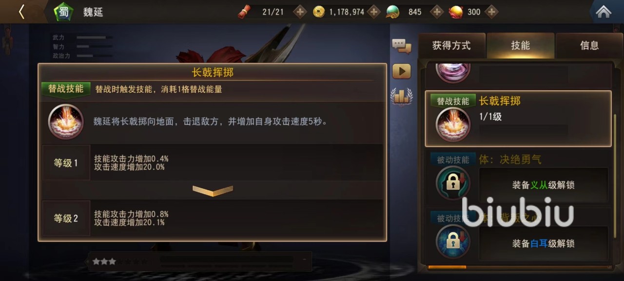 替补出战时,到达战场后会将手中武器投掷向地面,将范围内敌军全部击退,落地之后在5秒钟之内自身攻击速度大幅提升,也就是接下来5秒钟,魏延将进入小狂暴状态,输出非常可观,所以完全可以当做替补出战。要明确的是替补并不意味着强度低,而是充分利用好替战技能效果。