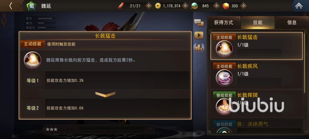 搭配之前当然要先了解好具体技能效果以及在战斗中的定位,魏延初始属性并不高,无论是武力还是体力都没有达到满值,而且只有三星,但是这也带来了很好成长空间,所以不能作为是否值得养成的依据,还要研究技能效果。第一个主动技能既有伤害又有眩晕,随着等级提升攻击力还会再次提高。第二个主动技能是利用手中武器以回旋攻击方式将对方拖拽到一起,造成大量伤害,是清理小怪很好用的技能。