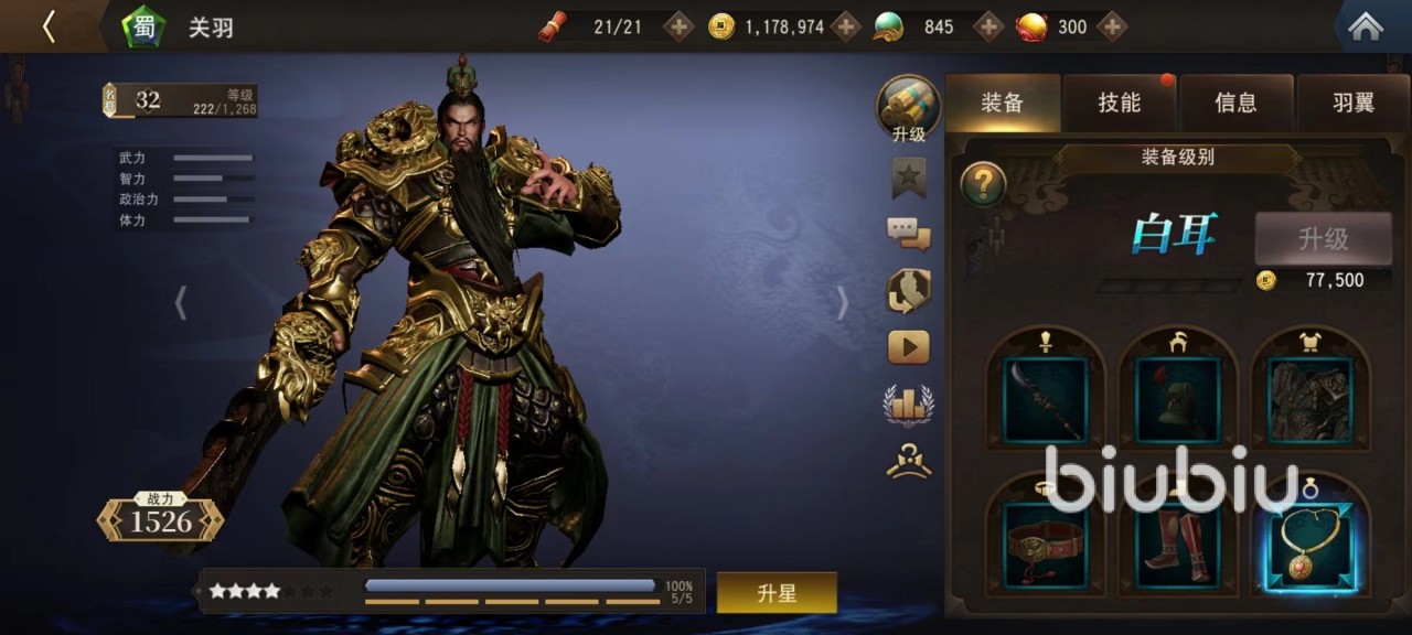 关羽作为新手就能获取的角色,在武力上丝毫不逊色于吕布,体力上更是有所超出,每个技能都很实用。常用输出青龙偃月直接释放出高额伤害刀气,将敌人击退,最后一次攻击时还能恢复自身血量。这点和吕布非常相似,都具有很好续航能力。第2个主动技能同样是向前方发动强力攻击,但是附加眩晕效果,并且将所有输出目标都拽到身旁。在被动加成下再次提升伤害和降低自身受到的物理输出。