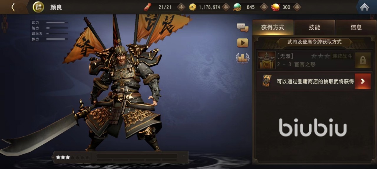 策划在设计武将时候精心准备了各种外形,对颜良来说非常炫酷,小编一度认为这是所有出战角色中最霸气的一个,背后插着的4张棋在打斗时候极其炫酷,也彰显了颜良河北名将风采。属性方面除了政治和智力用不到之外,需求的武力和体力都很可观,没有明显短板,在生存和攻击方面有出色表现。
