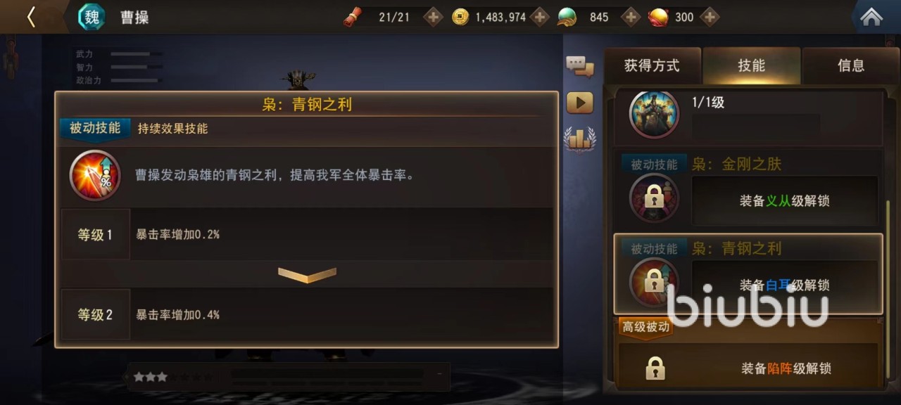 好在曹操并不依赖伤害技能发挥作用,依靠两个被动所带来的全体加成,第1个是发动金刚之力,降低我方所有单位受到的物理伤害,在刷副本过程中受到输出绝大多数都是物理,所以该技能适用范围极其广泛。第2个则是曹操灵魂所在,提高全军所有武将暴击率,现在很多角色都依靠暴击来吃饭,无论是群雄阵容的吕布,还是魏国阵营夏侯渊、甄姬等,以及其他很多角色都是如。暴击除了伤害提升之外,还有大量效果附加,而曹操是这些所有效果的提升来源。