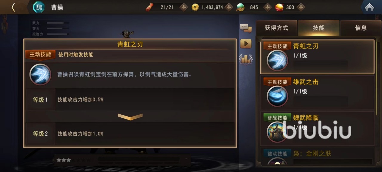 现在很多游戏中都将曹操当做是团队发动机般存在,这点在本游戏中也是如此,从技能效果中就能看出详情。并不是说曹操没有伤害,毕竟作为一名初始三星角色,最基础效果还是具备的,第一个主动技能就能召唤出宝剑在前方不断飞舞,造成大量伤害。第2个主动技能同样是发动蓄力攻击,使伤害到的目标强制腾空并且附加减速。但是相比于其他角色,自身无论是武力还是智力属性都稍差些,这也就意味着最终伤害数字不会太好看。