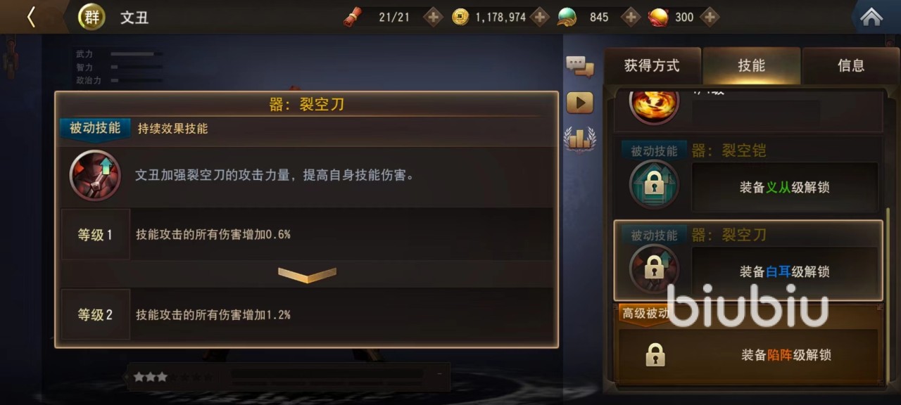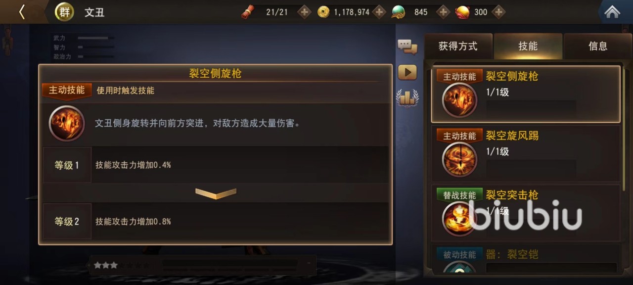 两个主动技能所攻击的方式不同,第1个是旋转前进向前方突进,并且利用手中武器造成大量输出,第二个则是围绕着裂空刀旋转起来,利用脚法伤害敌人。在攻击动作上非常好看,但是少了一些霸气,再加上自身形象不佳,所以视觉效果非常一般。替战触发技能也很普通,仅仅是挥动手中武器攻击周围敌人,没有特别出彩之处。