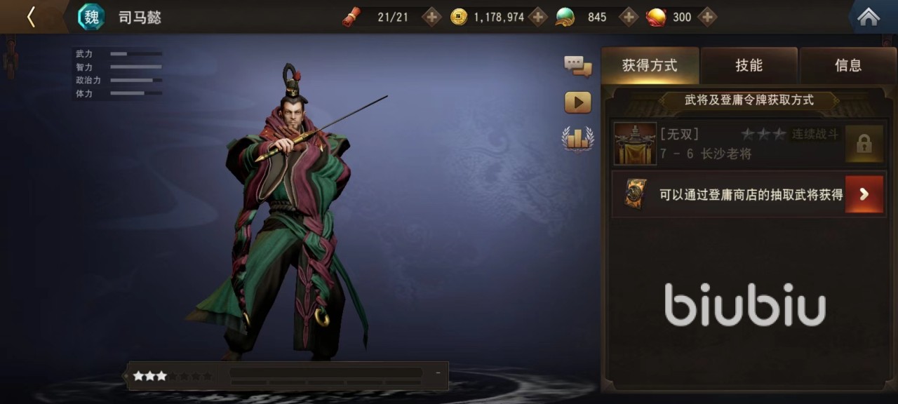 2023年03月13日 18:05 来源:月神立电击兽6司马懿作为三国历史中存活时间最长人物,贯穿了两个不同时代这点是其他人都不具备的优势,今天小编就来讲下三国诛将录司马懿怎么玩。在三国诛将录中司马懿作为三星猛将登场,而且拥有极高智力属性和政治力。虽然没有达到顶级4星,但是在属性上丝毫不差,而且阵容搭配更加简单,自身技能效果好。