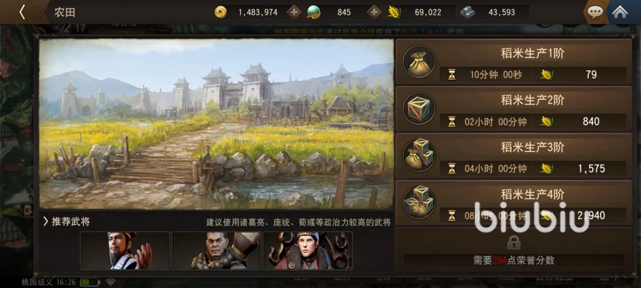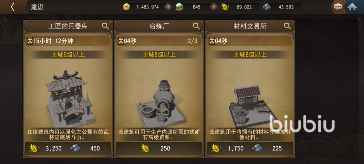 主城里面有多项分功能,再建造里面看到当前所有可以建造的建筑物,在这里也能查看到具体功能。这些建筑按照使用类型划分,有些是自动生产资源,例如农田和冶炼厂,在这里可以生产出大量稻米以及铁矿石,而稻米和铁矿石是重要资源,一定要优先建造和升级。尤其是稻米更是和士兵招募相关,事关开荒进度必须优先保证。