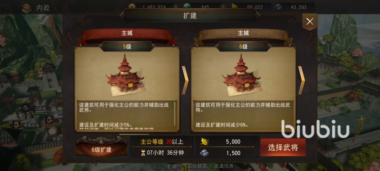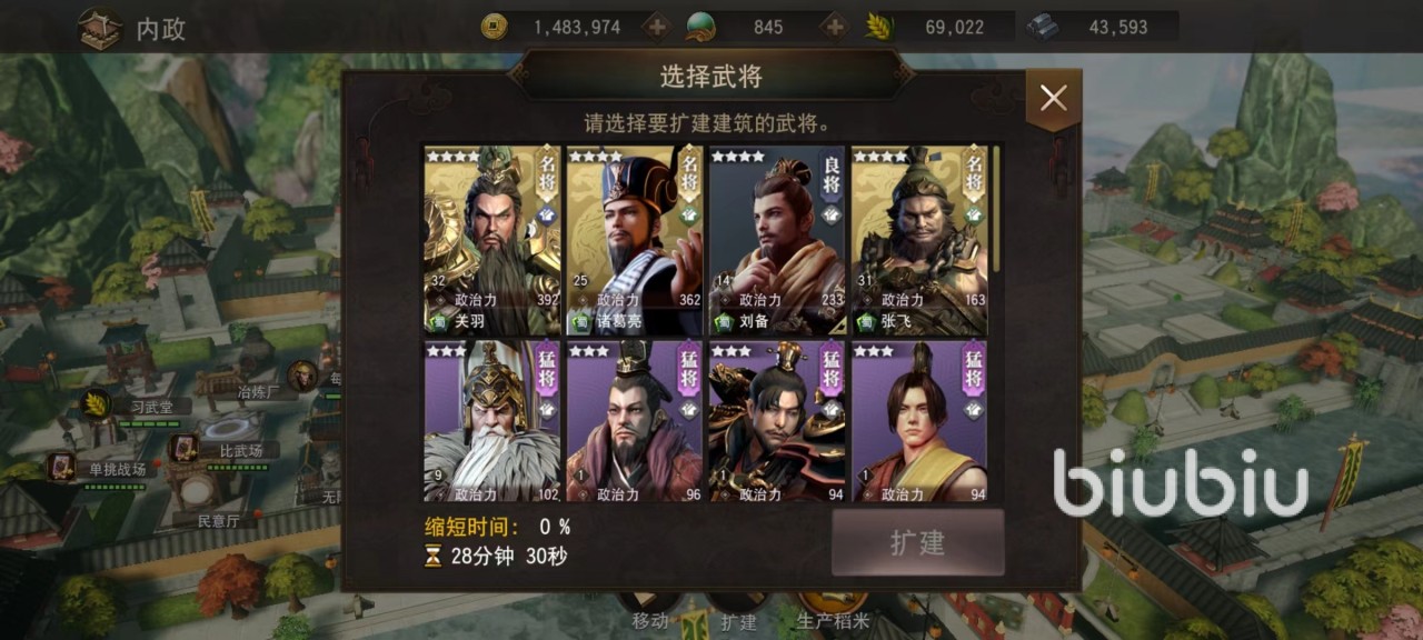 无论是进行建设还是升级,所操作步骤都是一样,选中之后可以在主城中这些空地上任意选择块位置建造。无论是建造还是升级,都需要选择武将加入其中帮助,依靠武将自身政治来提供加成。政治力越高,能缩短时间也就越多,可以优先培养出一个政治力高的角色充当建造官,这样能够大大缩短整体升级时间。尤其是主城扩建更是动辄十几个小时以上,所以政治武将选择重要性就更加突出,除了主城之外,其他建筑都可以自由改变位置。