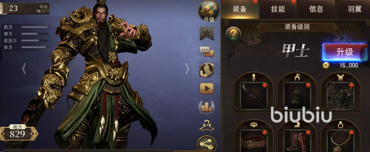 最后则是“身外之物”——装备了,在这款游戏中,一个武将至多可以装备六件装备,六个装备互不冲突,每个都有着自己的道具栏以及升级物品,玩家们在获得了自己心爱的装备后,可以用铁块打磨石来提升武器的属性,使用牛角,核桃木来为头盔加固,在升级的过程中,最为关键的是义从等级以及白耳等级,在这两个阶段中,装备会获得额外的技能并大幅提升固有属性。