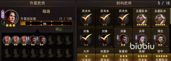 如果说等级是日积月累的提升的话,那么升星则是让武将可以质变的练度提升方式了,与升级带来的缓慢提升不同,每一次武将的升星都会为武将们带来大量的提升,不过所需要消耗的道具自然也是比兵书要珍贵的,因为升星所需要的材料为其他武将。当玩家们抽取到不想要的武将的话,可以直接使用他们为自己的主力进行升星,但是在到达了相应的星级上限后,就需要玩家们使用相同的武将来进行“突破”了,这也是为什么说高星武将的上限要比低星的要高很多的原因,因为高星的多次升级机制让稀有武将光是在升星这个机制上就能占很多便宜,所以各位小伙伴们如果抽到了相同的武将后千万不要随意售卖哦!