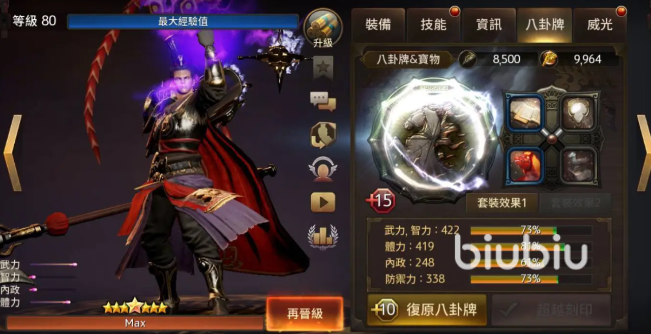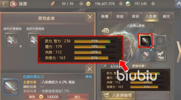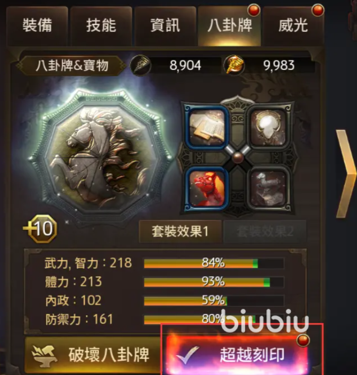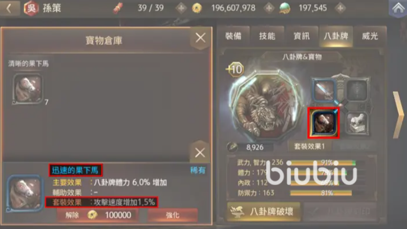 在游戏当中,宝物主要分为四种,基本的武器,方牌以及马匹和玉玺。每一种都对应着相应的思维属性,把宝物装配在八卦牌上面可以额外提升角色的能力。需要注意的是,八卦牌方面至少有刻印一个以上的八卦牌才能装宝物。