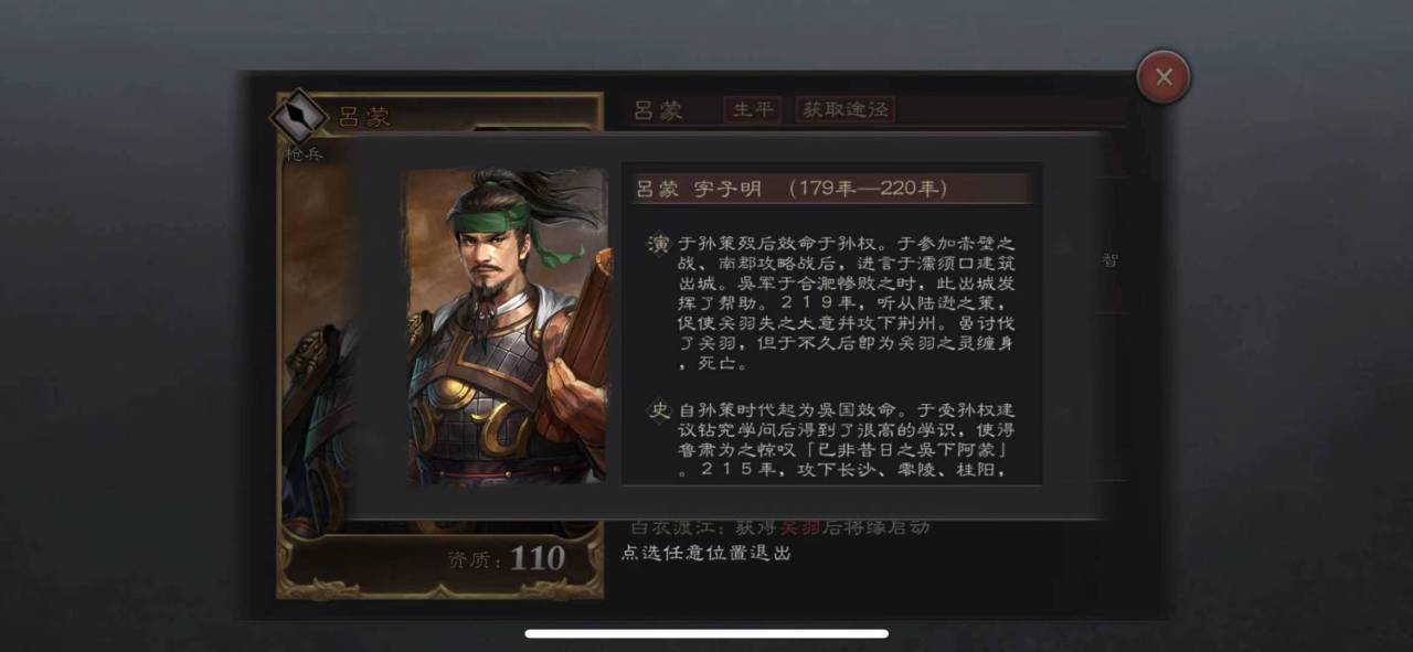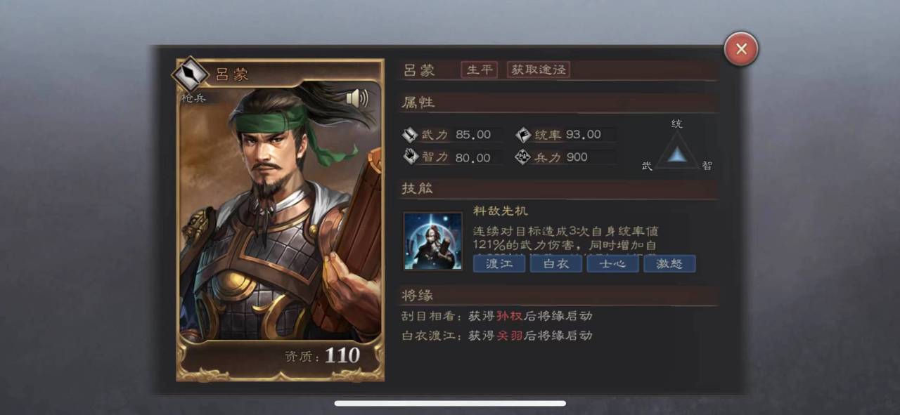 吕蒙早年跟随孙策出战屡立战功,是真正意义上击败关羽的人,在三国志威力无双中,吕蒙具有非常好的身板,足够的输出强度和防御能力,可以说是一个有功有守的全面型武将。在技法上也有着不错的控制能力,110的资质在SR武将中也算是比较高的,整体都比较高,但是和输出手想比还稍稍逊色一点。但是在统率能力上绝对是一顶一的角色。