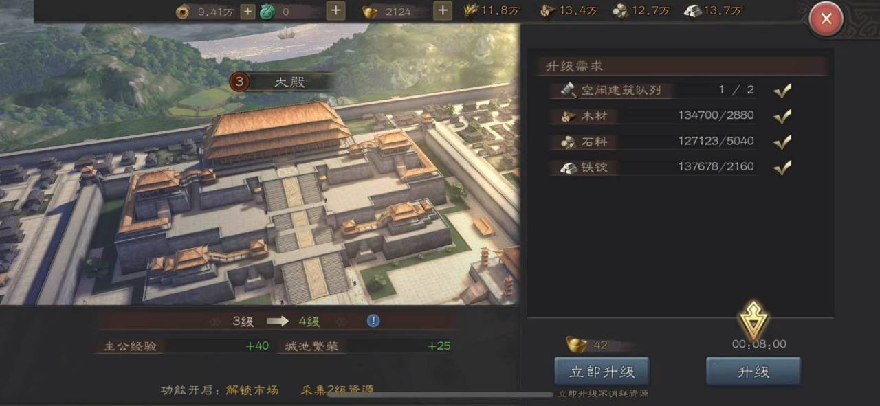 大厅的升级需要很多物资来实现,我们需要收集足够的资源,这个就需要我们在日常游戏中收集好资源,发展各种基础设施,平时就要多多升级采石场伐木场等基础设施,生产出资源之后及时的收取资源,在城市内部发展安定之后我们还可以向外拓张,对外进行征战,可以在野外和土匪发生战斗来获得资源,派遣队伍去攻打地方城池搜刮资源,来满足大厅升级的需要。