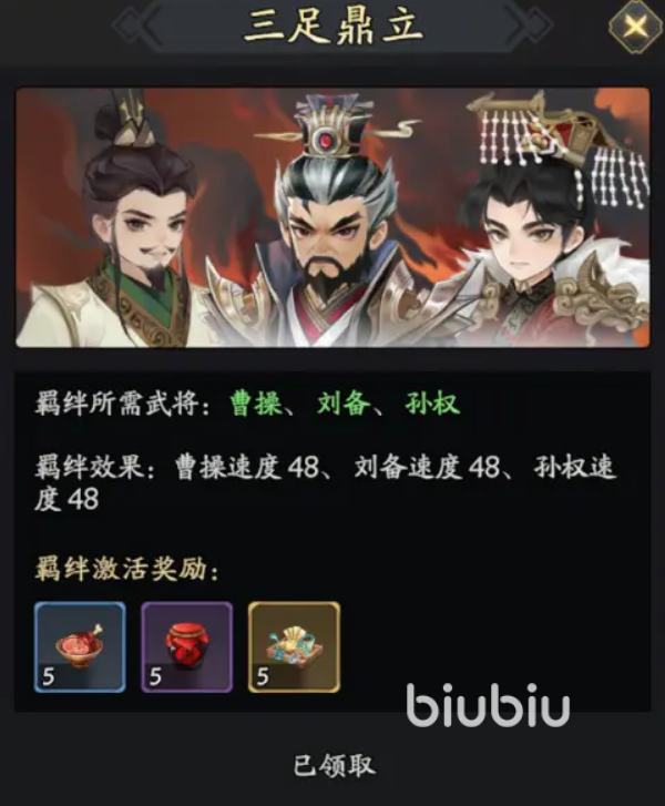 在阵容搭配上,若能同时拥有曹操、刘备和孙权,便可解锁专属羁绊【三足鼎立】,曹操、刘备、孙权三人速度均增加48。速度的提升在战斗中至关重要,能让武将更快出手,抢占先机。