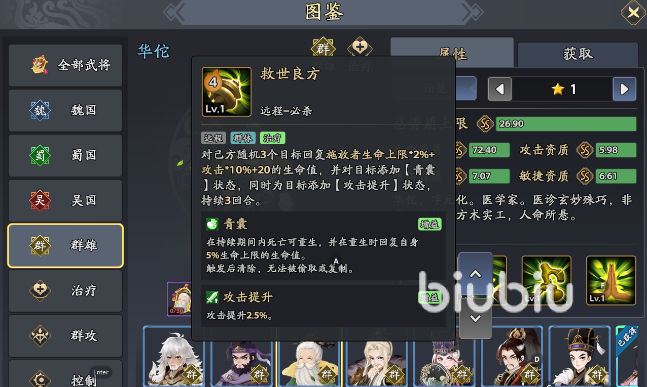 华佗:核心复活奶,【青囊】状态为夏侯惇、吕蒙等提供二次生命,确保前排站场;