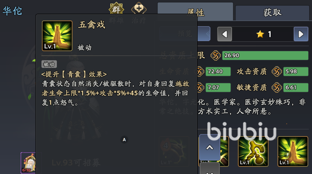 加点优先级:1.五禽戏(被动2)→2.救世良方(大招)→3.刮骨疗毒(主动技)→4.世之医圣(被动1)