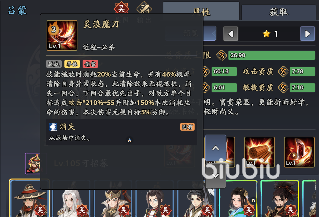 吕蒙:单体收割,【炙浪魔刀】高伤但需消耗20%当前生命,双治疗体系可稳定血线,残血时触发【青囊】复活反打。