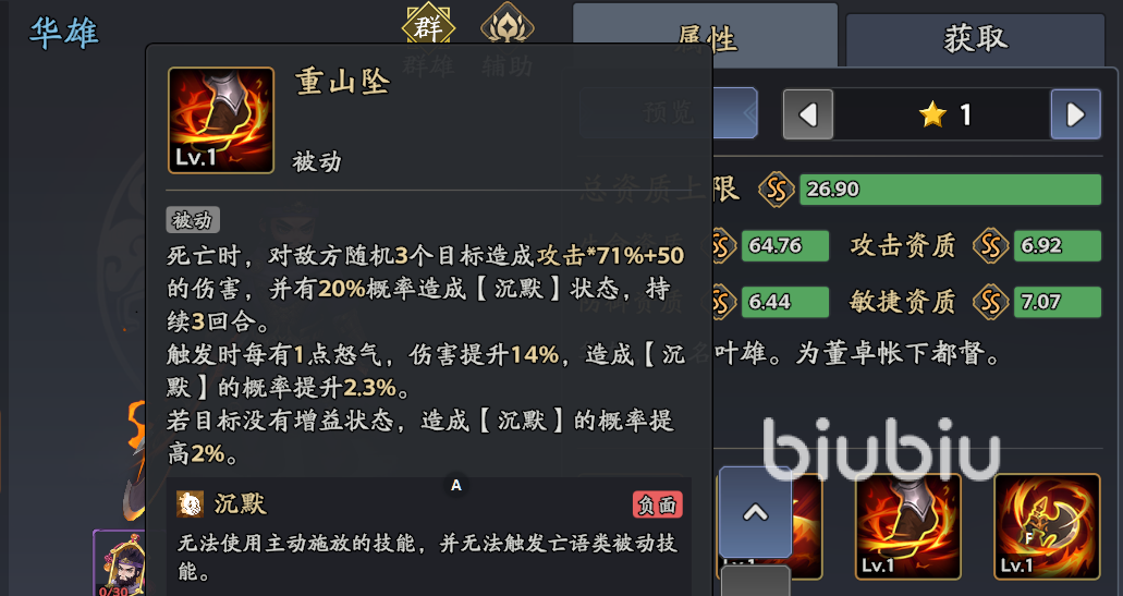 效果:阵亡时对随机3目标造成AOE伤害(71%攻击+50),怒气越高伤害与沉默概率越高(每点怒气+14%伤害+2.3%沉默概率);若目标无增益,沉默概率额外+2%。