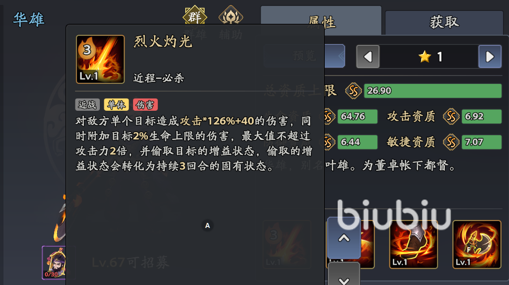 效果:提升主动技伤害15%、偷取概率32%,成功偷取时30%概率回1怒气。