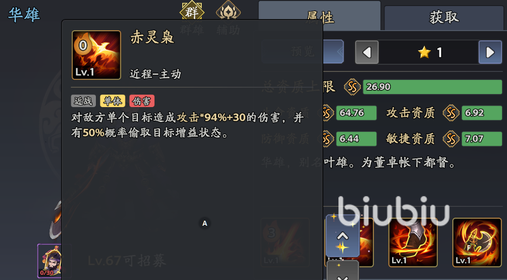 效果:单体伤害(94%攻击+30),50%概率偷取增益,升满后偷取概率提升至82%(被动2加成)。