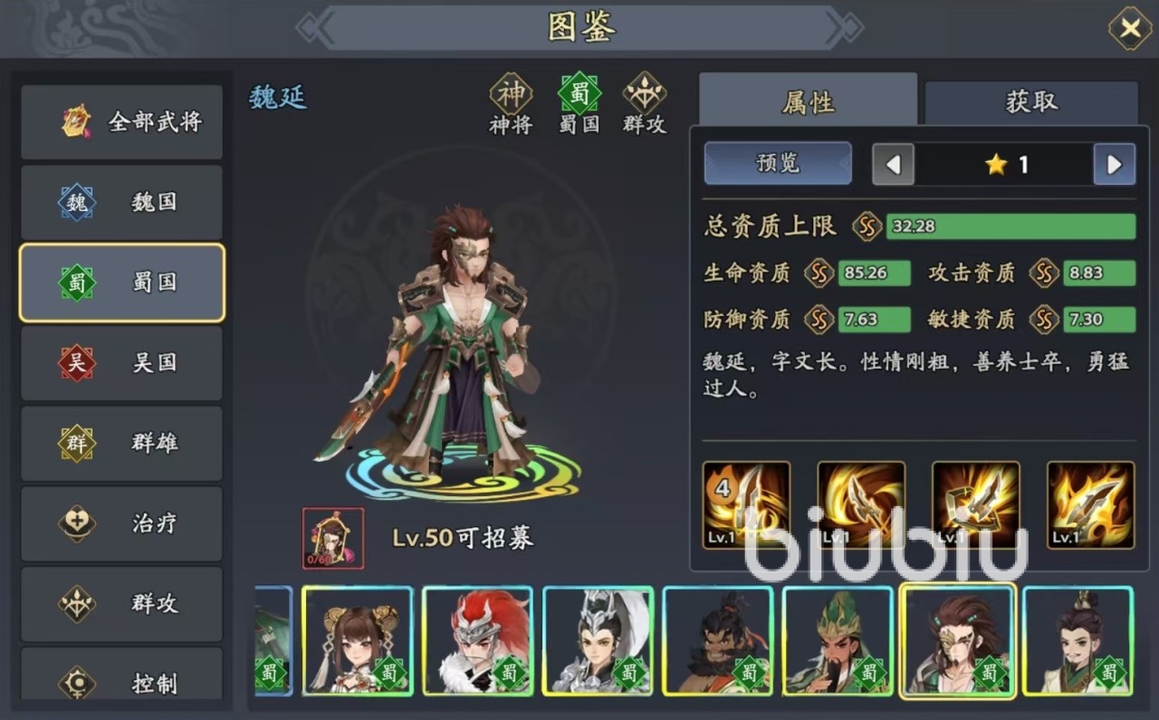 大家可以通过试炼之路等方式来获取魏延,这是属于蜀国阵容的群攻型神将。自身必杀技能可以对敌方以及左右两侧的目标造成伤害,本次伤害有几率将目标身上的增益状态驱散。另外三个全是被动效果,可以使普通攻击附带横扫,造成伤害时有几率对目标造成流血,以及按照目标生命上限去附加伤害等。所以说魏延的输出还是非常犀利的。为了让输出变得更加强势,加点方面当然是选择全武力。