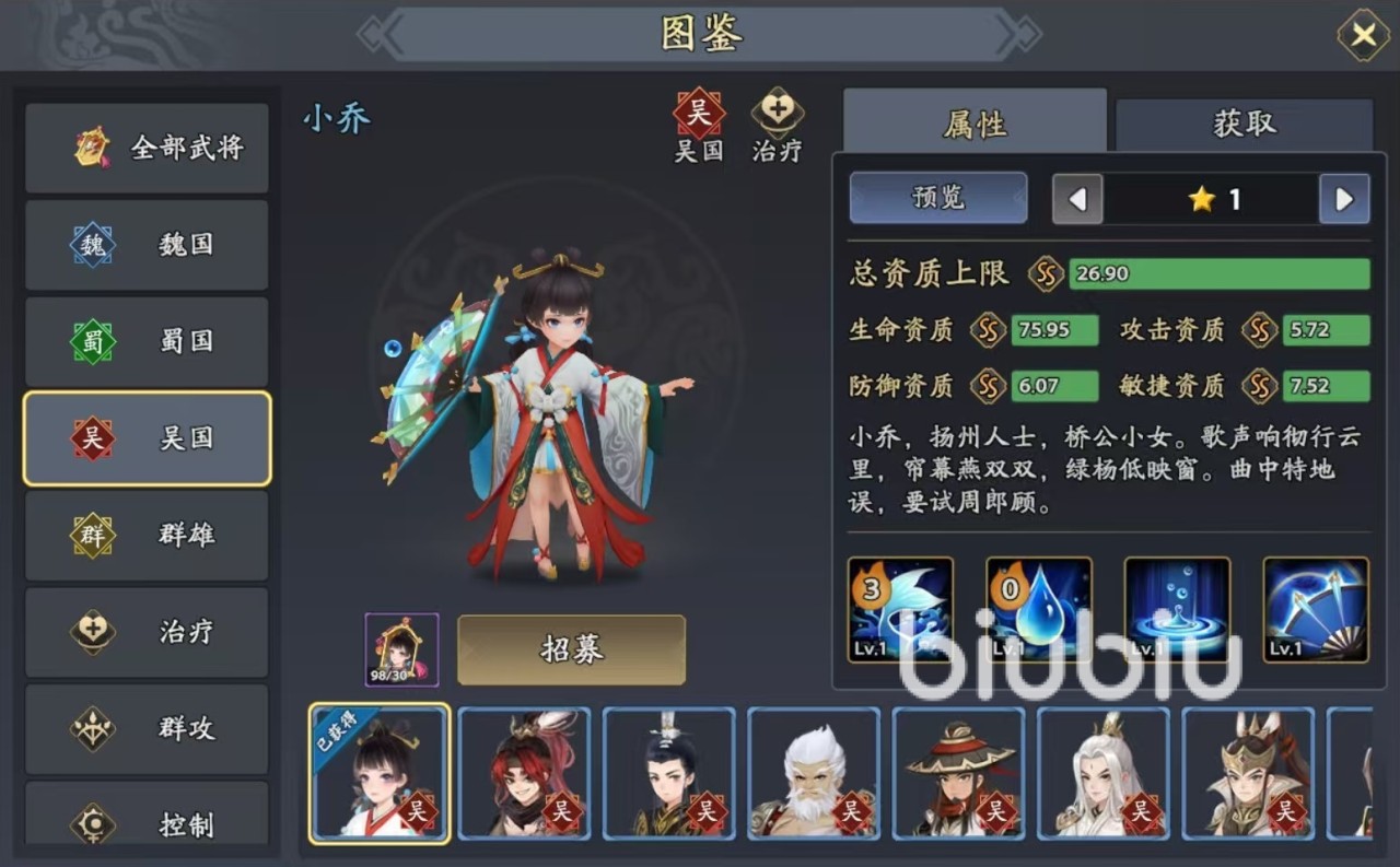 阵容搭配的时候,小编推荐选择小乔、甘宁、黄盖和周瑜作为队友。小乔是吴国阵容中的治疗角色,利用自身的必杀技,能够治疗己方随机三个目标,并且自身获得防御提升状态。主动技能是对单个目标进行回复,还有几率清除目标身上的异常状态。甘宁是属于输出类型,在单体伤害方面非常强势,无论是必杀技还是主动技,都可以打出可观的单体伤害。黄盖的作用自然是在前排吸收伤害,作为防御型的武将,黄盖在战斗回合开始时,就可以直接给己方全体带来援护,自身获得苦肉状态,在此状态下可提升反震概率和效果。