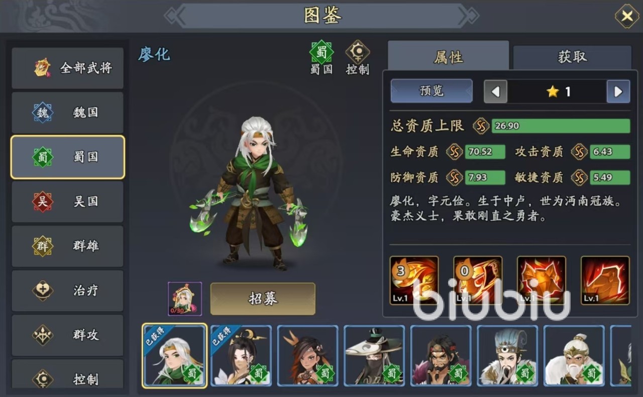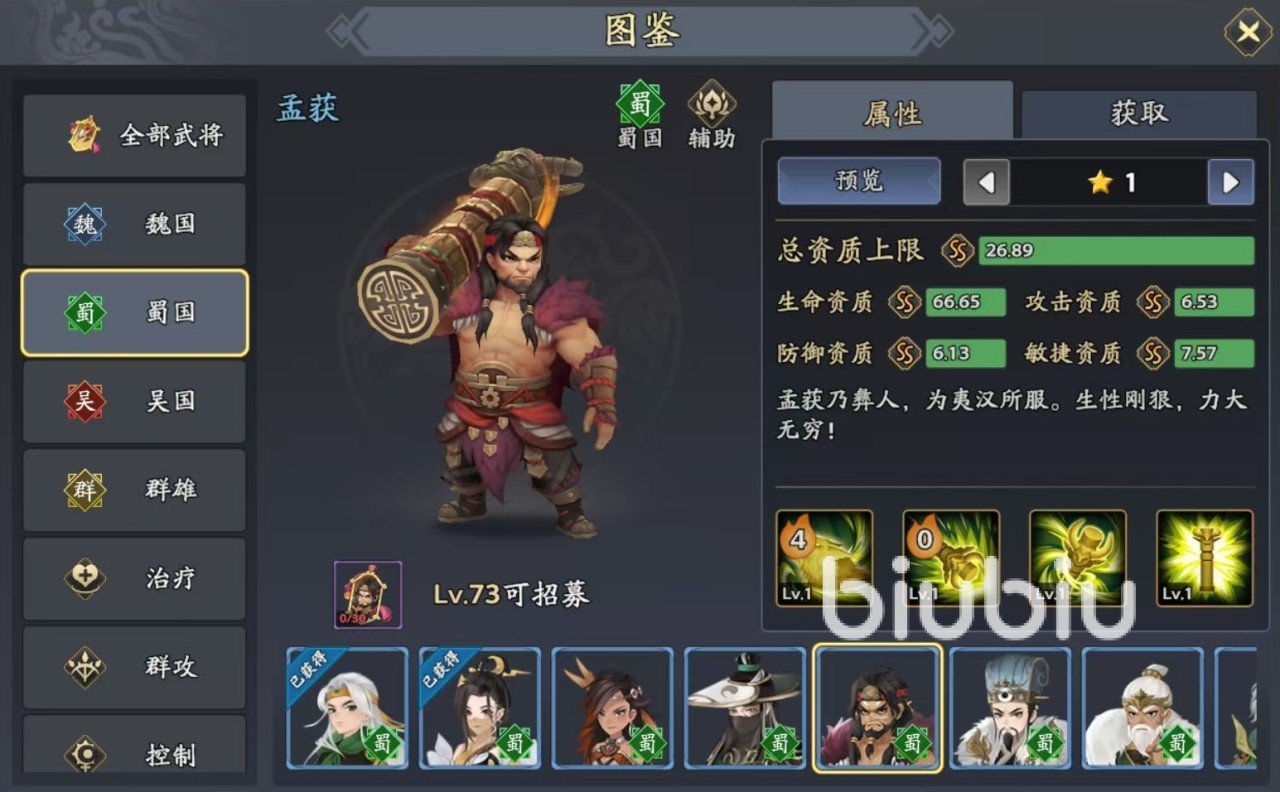 廖化是一个很容易就获取到的武将,但是强度并不低,它的必杀技伤害单体目标,有几率造成混乱状态,对方被混乱之后,普攻将会随机选择目标,很大概率会自相残杀,所以非常有用。孟获是属于辅助类型,自身必杀技能可以给己方目标回复怒气,怒气对于武将来说非常重要,这是孟获的优势所在。其他技能还有添加攻击提升状态等效果,伤害提升更高。