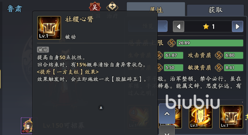 鲁肃被动【社稷心膂】概率清除自身异常,残血时【一方支柱】必解控+免疫控制,克制貂蝉、陈宫等控场武将。