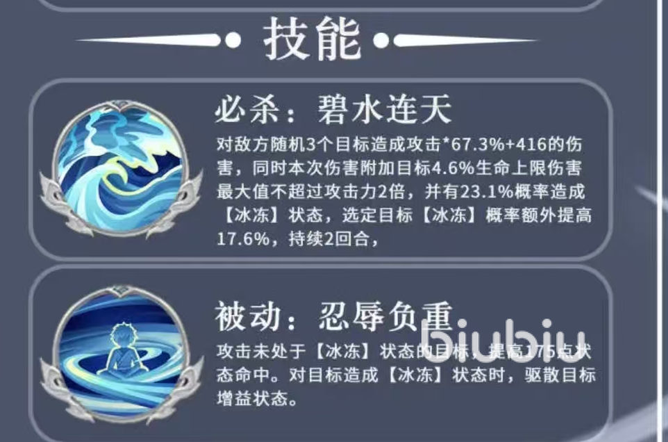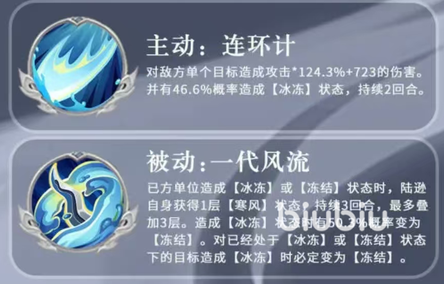 接着是主动技能和大招,主动技能可以对单体目标造成一次伤害,有一半的概率可以附加冰冻效果,伤害整体很低,加点优先级不高,大招是对三个目标造成伤害,而且可以根据敌方的生命值造成伤害,并且还附加群体冰冻控制效果,可以强化吕蒙的整体,加点的优先级比较高。