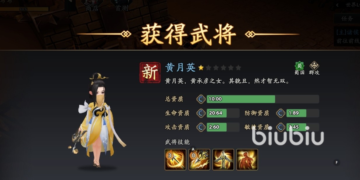 黄月英:美若天仙被动,提升技能伤害提高、命中提高,同时驱散概率,是功能齐全的群攻副C。