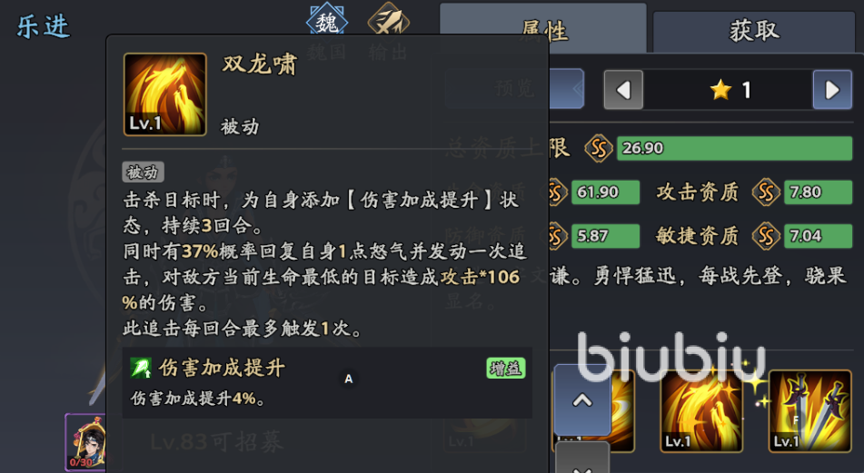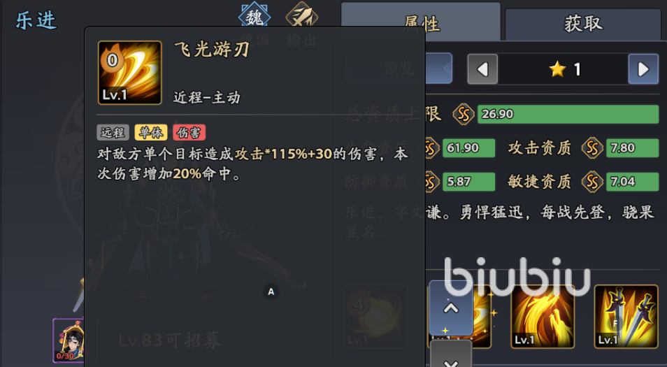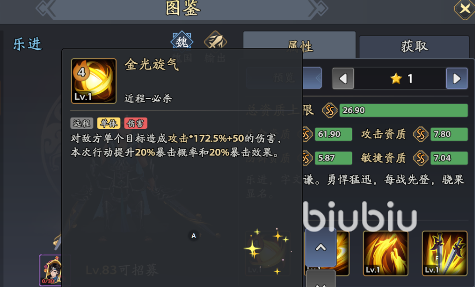 效果:单体172.5%攻击+50伤害,提升20%暴击率与暴击效果,27%概率无法被援护(升满后概率提升至50%)。