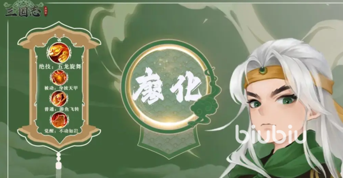 廖化的被动能在出场或释放绝技的时候,对自身以及所属主角添加一个“忠诚护盾”3回合,护盾能吸收一定伤害,提升持有者157点状态命中,并在每回合结束的时候帮助获得1点怒气。