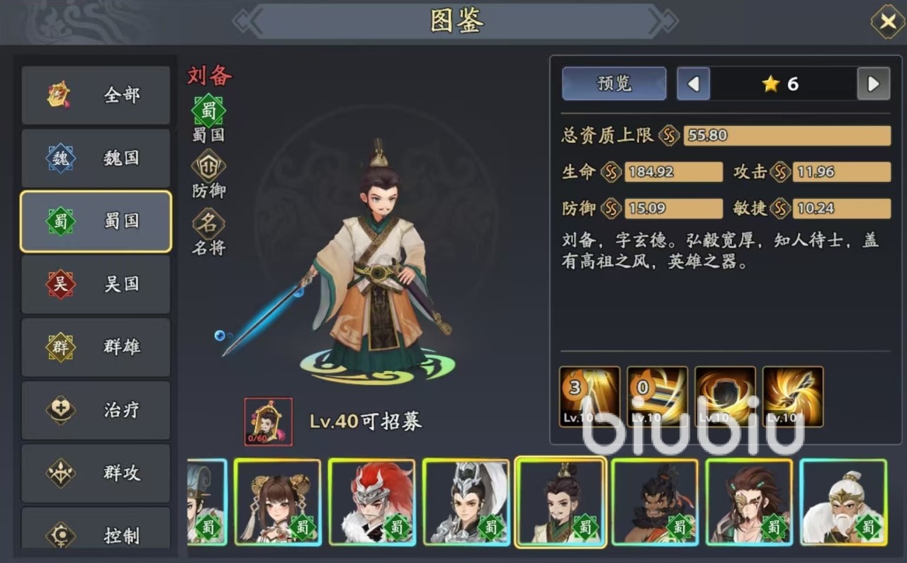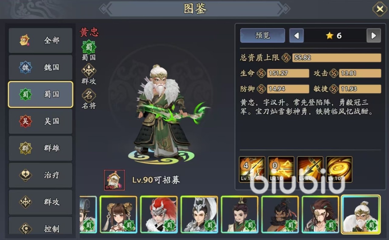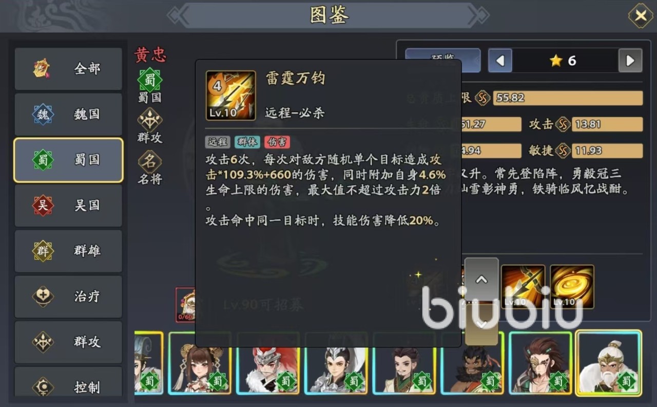结合这些技能效果,黄忠就是游戏中典型的远程输出型武将,在单体伤害和群体输出方面都非常。技能搭配方面当然是以蜀国阵容为主,可以配合上张飞、刘备这样的辅助和防御型武将,就能够很好地战斗了,黄忠就在后排放心的进行输出。张飞虽然定位是辅助,但是自身的输出同样强势,尤其是自身的必杀技能,直接恢复大量生命值,并进入到万夫不当状态,在防御、输出方面都极为出色。刘备的效果同样强势,可以为自身和两个随机目标添加结义状态,结义之后就可以分担同等伤害,免疫偷取,这样黄忠在后排就不用怕切了。