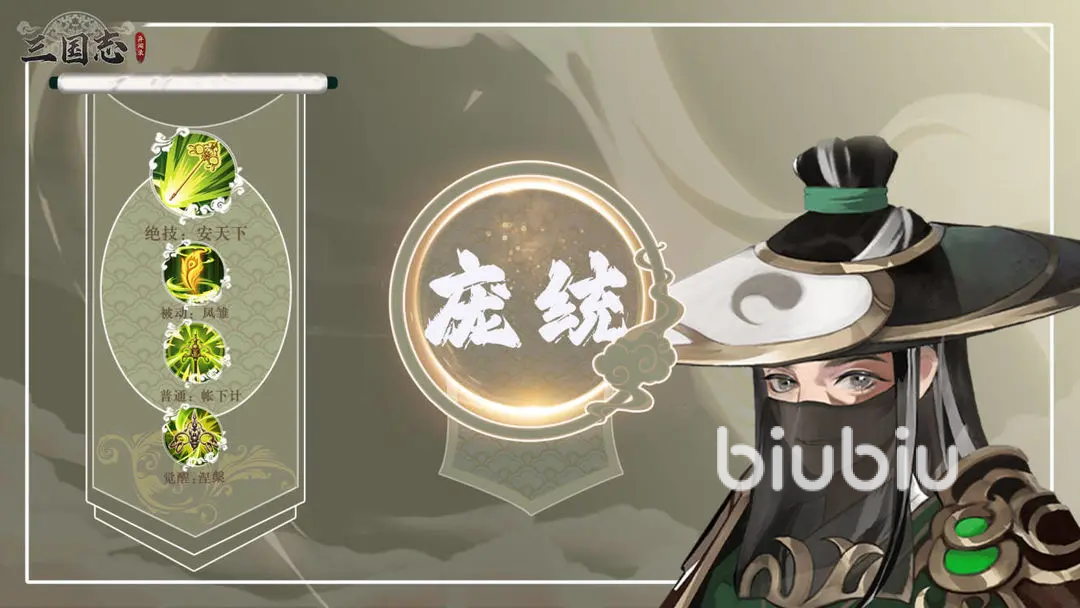 被动“涅槃”,回合开始时给自身增加“压制”状态,持续2回合,最多叠加3层,压制状态能有效提高他的输出效果。被动2“凤雏”,提高自身16.6%敏捷,110点状态命中,提升“帐下计”效果攻击时,有46.6%概率对目标造成持续2回合的“石化”状态。